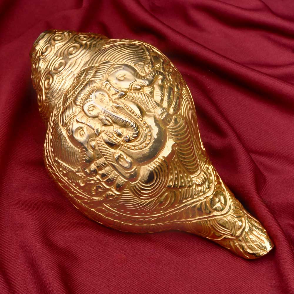This beautifully crafted and gold-plated natural shankh features an intricate depiction of Lord Ganesha in his rare Ashtabhuja (eight-armed) and Trimukhi (three-faced) form, surrounded by ornate patterns that enhance its divine and majestic look. The shankh has a radiant golden finish with detailed embossing across the body and a smooth, functional mouthpiece. The gold plating is thick and highly durable.
