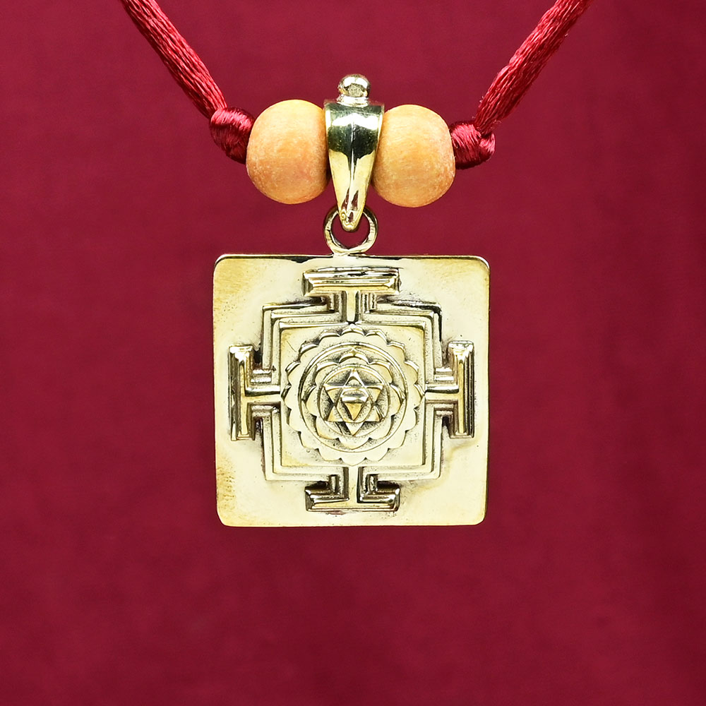 This pendant features a bold and intricately elevated 3D Baglamukhi Yantra in lustrous brass, showcasing the traditional symmetrical layout with sharp triangular geometry and lotus-like concentric layers symbolizing the power to stun and paralyze negativity. Set on a square brass base, the yantra is suspended from a red sacred thread with two smooth, natural wooden beads near the loop, creating a balanced and spiritually charged design ideal for daily wear or sadhana.