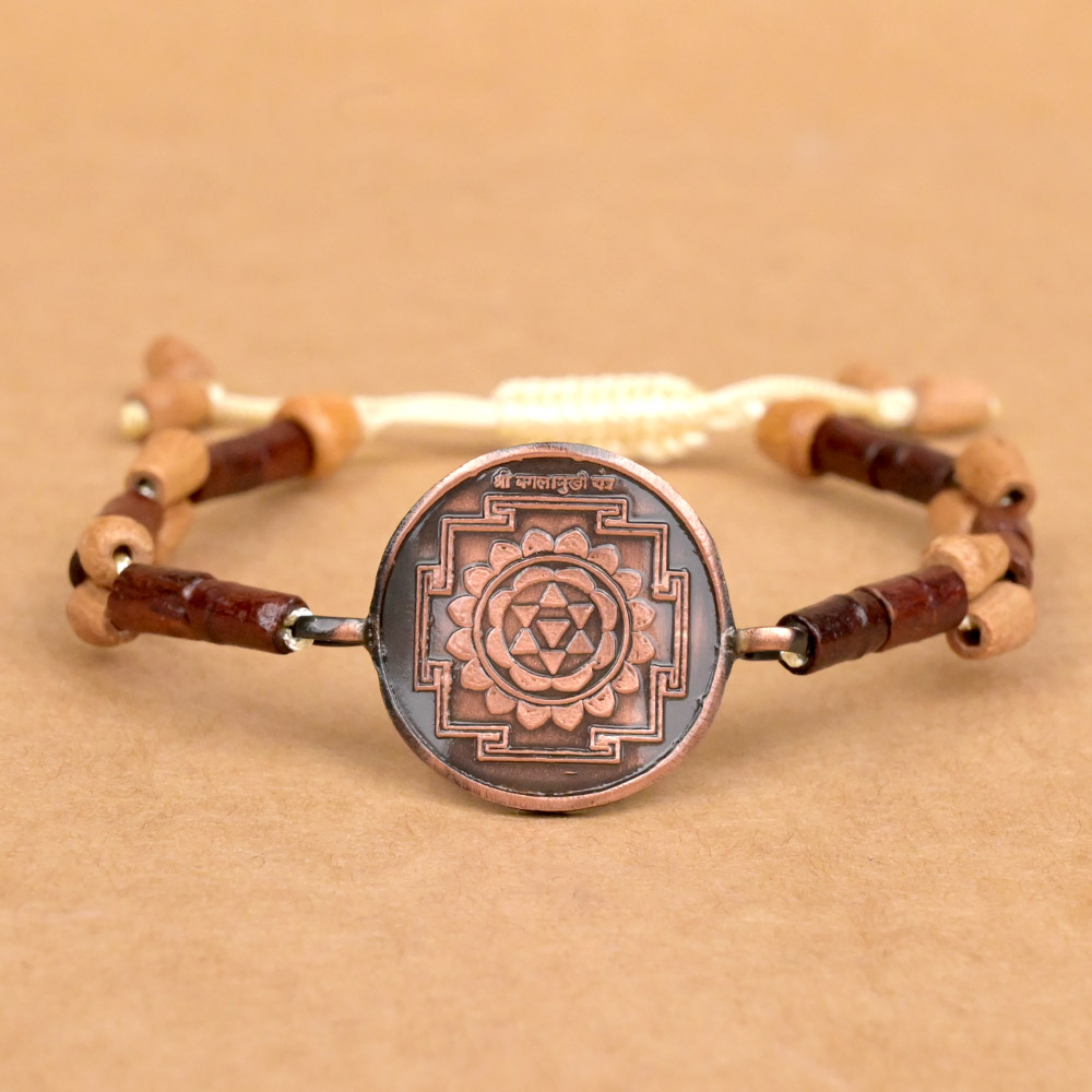 The Baglamukhi Yantra Bracelet in Copper has the Yantra perfectly and neatly embossed on a round copper coin which is slightly curved to fit the wrist. The image of Baglamukhi Devi is etched with precision on the reverse side of the Yantra, designed to touch the skin when worn. The Bracelet is strung in an adjustable thread with wooden Beads of cylindrical and round shapes, making this Bracelet more appealing.