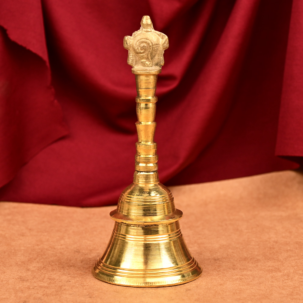 Enticing bell with Lord Balaji Sudrashan chakra design on top of handle is exceptionally designed on fine quality brass. Bell is used while performing aarti that lends a melodious tone while singing chants. The tingling sound of bell creates spiritual waves and drowns distracting thoughts and inauspicious noises.