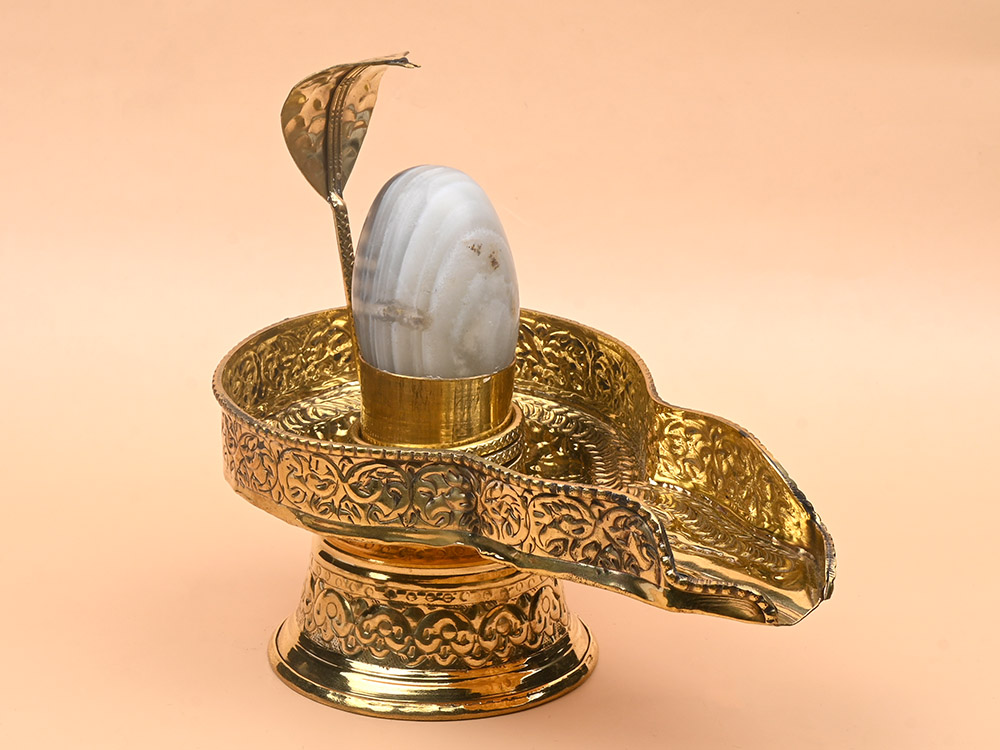 This set features a premium quality natural rare Banalingam carefully placed on an intricately designed brass Yoni base adorned with a serpent hood. One of the most revered Shivlings for worship Banalingams are one-of-a-kind naturally occurring self-forming (Swayambhu) Shivlingams found only in the Narmada River bed in Madhya Pradesh India. Reemerging from the riverbed just a couple of times every decade these Banalingams are very unusual. Here a brass Yoni with an elaborate pattern and snake hood enhances the spiritual importance of the Lingam and Yoni base which is usually carved from genuine Narmada river stone.