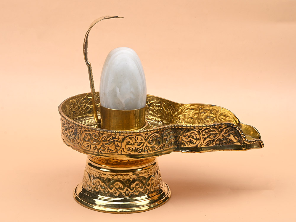 This set features a premium quality natural rare Banalingam carefully placed on an intricately designed brass Yoni base adorned with a serpent hood. One of the most revered Shivlings for worship Banalingams are one-of-a-kind naturally occurring self-forming (Swayambhu) Shivlingams found only in the Narmada River bed in Madhya Pradesh India. Reemerging from the riverbed just a couple of times every decade these Banalingams are very unusual. Here a brass Yoni with an elaborate pattern and snake hood enhances the spiritual importance of the Lingam and Yoni base which is usually carved from genuine Narmada river stone.