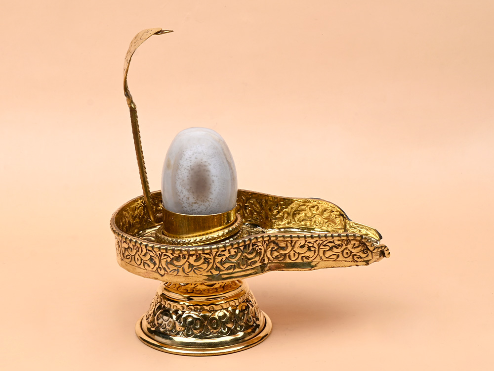 This set features a premium quality natural rare Banalingam carefully placed on an intricately designed brass Yoni base adorned with a serpent hood. One of the most revered Shivlings for worship Banalingams are one-of-a-kind naturally occurring self-forming (Swayambhu) Shivlingams found only in the Narmada River bed in Madhya Pradesh India. Reemerging from the riverbed just a couple of times every decade these Banalingams are very unusual. Here a brass Yoni with an elaborate pattern and snake hood enhances the spiritual importance of the Lingam and Yoni base which is usually carved from genuine Narmada river stone.