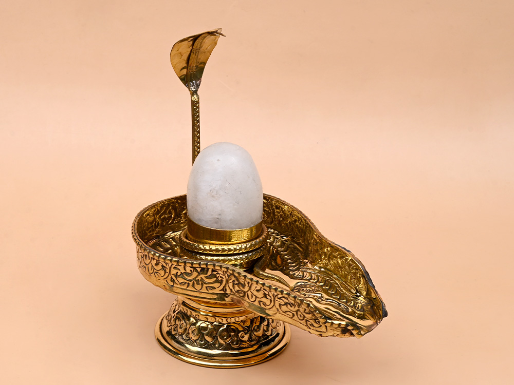 This set features a premium quality natural rare Banalingam carefully placed on an intricately designed brass Yoni base adorned with a serpent hood. One of the most revered Shivlings for worship Banalingams are one-of-a-kind naturally occurring self-forming (Swayambhu) Shivlingams found only in the Narmada River bed in Madhya Pradesh India. Reemerging from the riverbed just a couple of times every decade these Banalingams are very unusual. Here a brass Yoni with an elaborate pattern and snake hood enhances the spiritual importance of the Lingam and Yoni base which is usually carved from genuine Narmada river stone.