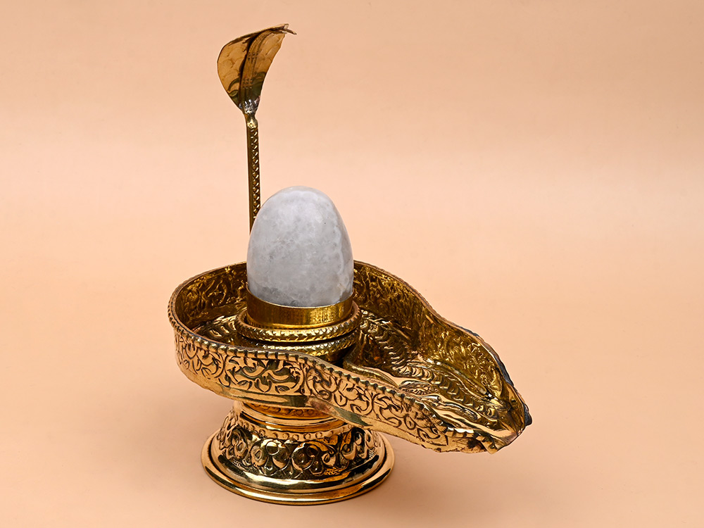 This set features a premium quality natural rare Banalingam carefully placed on an intricately designed brass Yoni base adorned with a serpent hood. One of the most revered Shivlings for worship Banalingams are one-of-a-kind naturally occurring self-forming (Swayambhu) Shivlingams found only in the Narmada River bed in Madhya Pradesh India. Reemerging from the riverbed just a couple of times every decade these Banalingams are very unusual. Here a brass Yoni with an elaborate pattern and snake hood enhances the spiritual importance of the Lingam and Yoni base which is usually carved from genuine Narmada river stone.