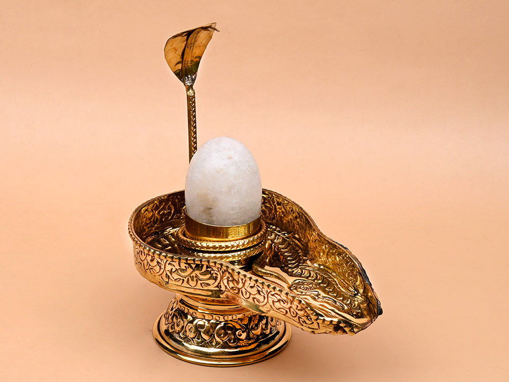 This set features a premium quality natural rare Banalingam carefully placed on an intricately designed brass Yoni base adorned with a serpent hood. One of the most revered Shivlings for worship Banalingams are one-of-a-kind naturally occurring self-forming (Swayambhu) Shivlingams found only in the Narmada River bed in Madhya Pradesh India. Reemerging from the riverbed just a couple of times every decade these Banalingams are very unusual. Here a brass Yoni with an elaborate pattern and snake hood enhances the spiritual importance of the Lingam and Yoni base which is usually carved from genuine Narmada river stone.