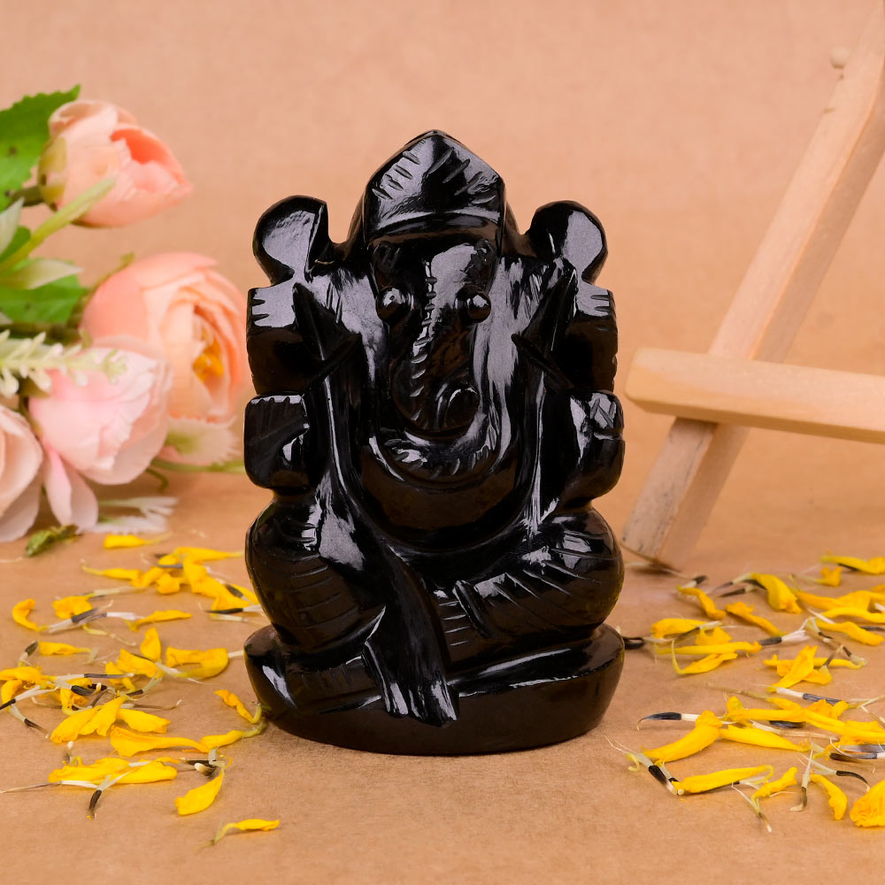 Lord Ganesha crafted on single piece of Natural Black Agate gemstone resonates with divinity and sheen. Lord Ganesha in seated pose is holding weapons and Modaka in His hands. Black Agate provides serenity, balance, strength, success and courage. Place The Idol in your puja altar, near house entrance or on car dashboard of His divine blessings.