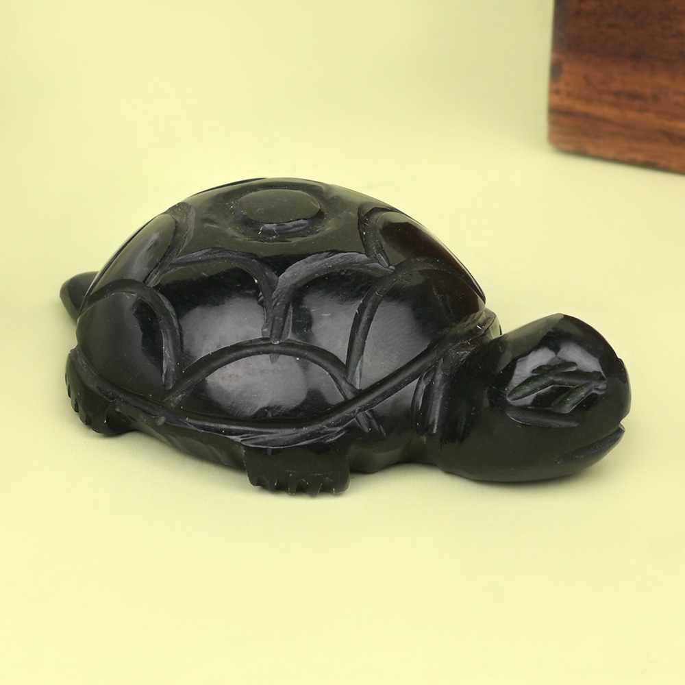 This Kurma (tortoise avatar of Lord Vishnu) is carved out of natural black Jade gemstone for power and protection from negative energies. Kurma (tortoise the manifestation of Lord Vishnu incarnated to provide support during the event of Samudra Manthan (churning of the ocean). Kurma represents grounding, steadiness, stability, an important aspect associated with the planet Saturn, and thus worship of this form helps balance the effects of the planet. Made in black Jade, this Kurma dispels energies of doubt, envy, anger and fear encourages respect and brings stability and success in finance and business. It is to be placed in office table/ work desk/living room with the mouth of the tortoise facing West direction.