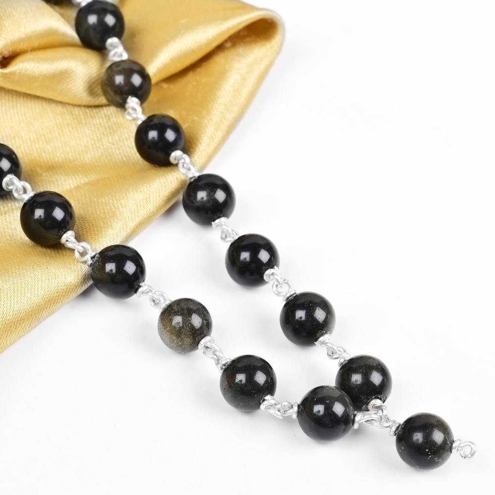 This distinctive mala is crafted from premium grade Black Obsidian beads, each individually secured with finely worked 925 silver wire for durability and refined detailing. The beads show a deep lustrous finish, allowing a smooth structured flow during use.