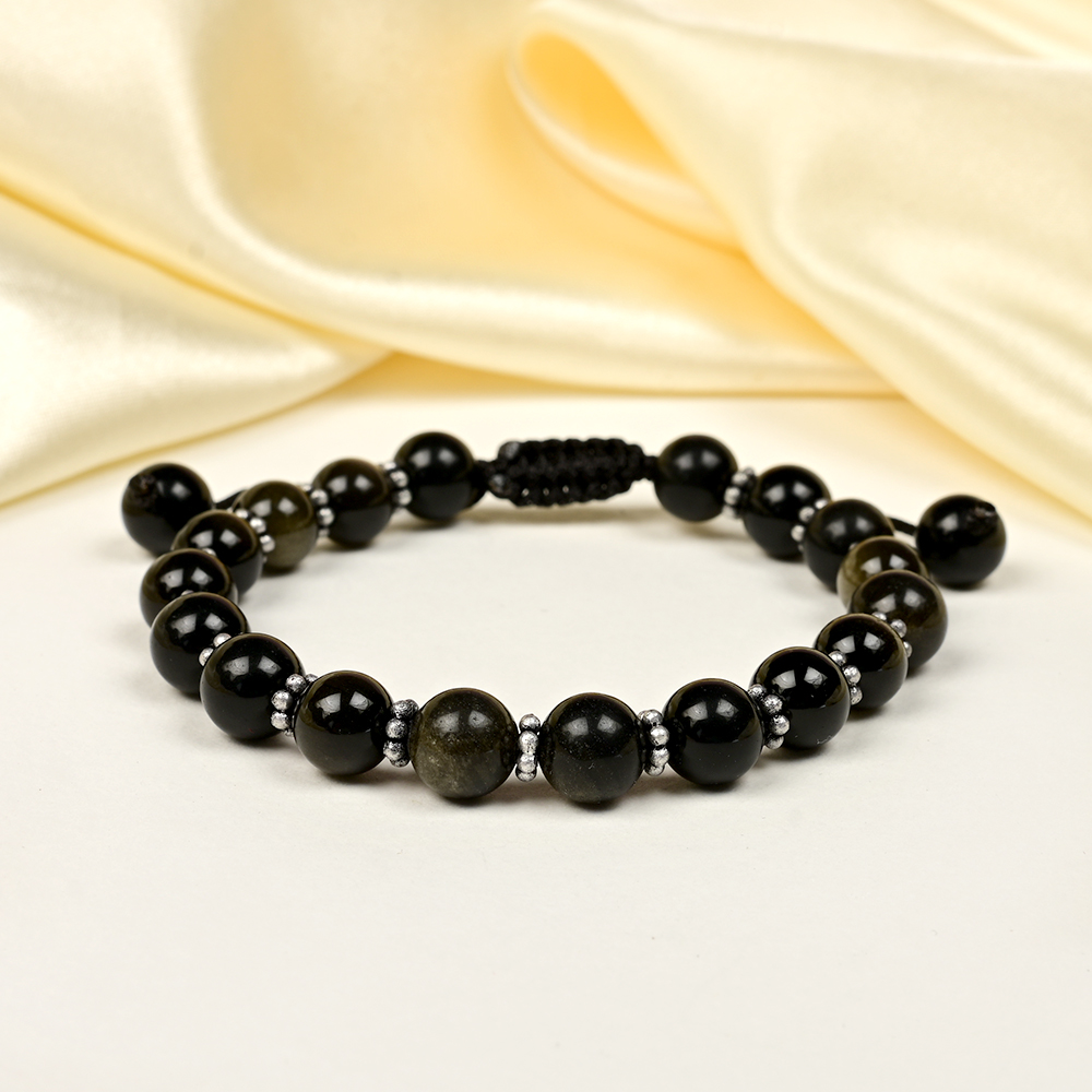 This Black Obsidian German Silver Chakri Bracelet is a striking blend of elegance and protection, crafted with polished natural Obsidian beads interspaced with intricately designed German Silver chakri spacers. The glossy black finish of Obsidian harmonizes beautifully with the subtle metallic shine of silver, creating a bracelet that is both bold and refined. The adjustable thread design ensures a comfortable and secure fit for daily wear. Black Obsidian is revered as a powerful protective and grounding stone, believed to shield against negativity, clear emotional blockages, and promote inner strength.
