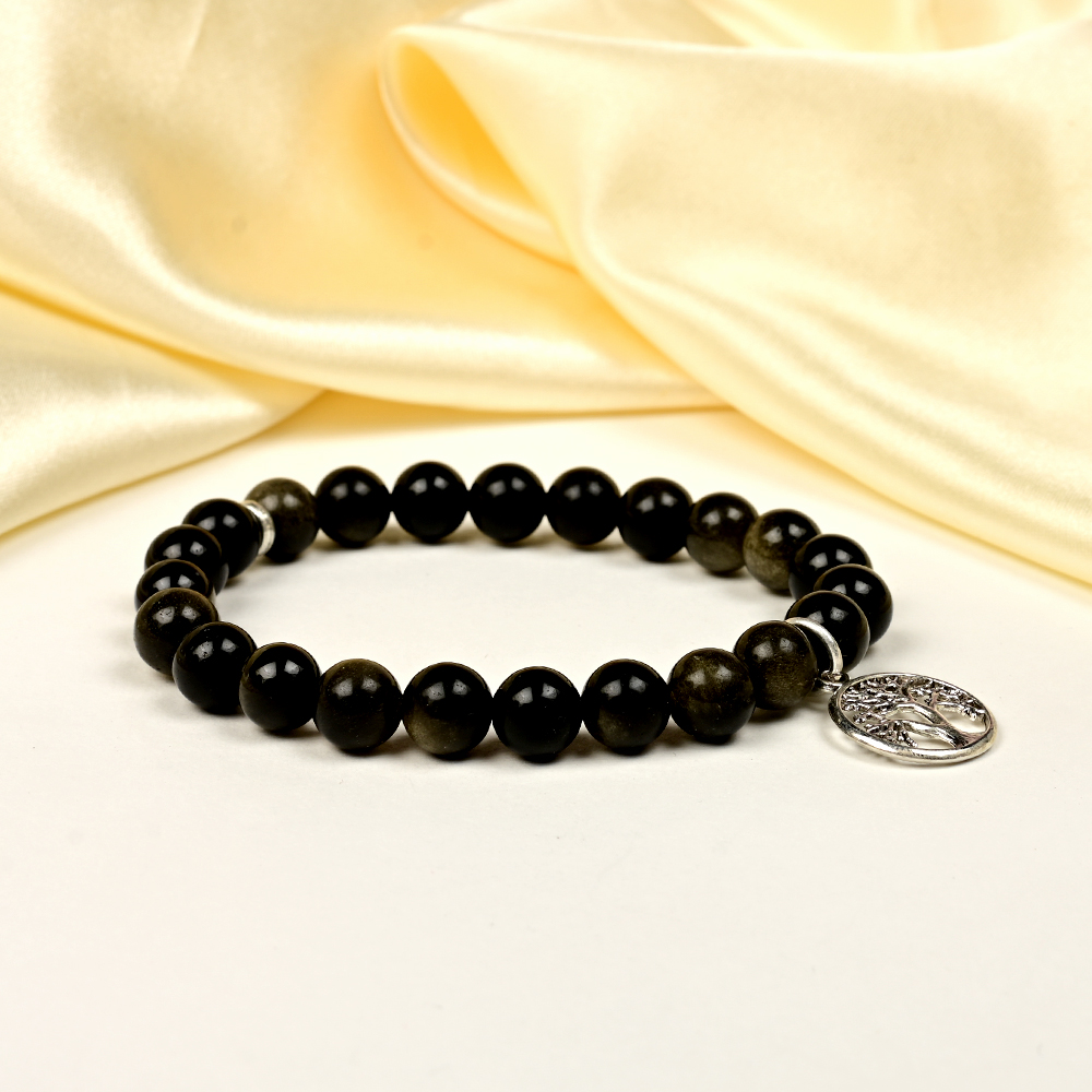 This Black Obsidian Tree of Life Bracelet is a beautiful fusion of strength and symbolism, crafted with polished natural Obsidian beads and adorned with a finely detailed Tree of Life charm in silver tone. The deep, glossy black beads represent grounding and protection, while the Tree of Life charm symbolizes growth, balance, and eternal connection with nature. Its stretchable design ensures a snug and comfortable fit for everyday wear. Black Obsidian is known as a stone of protection and clarity, helping to dispel negativity, strengthen focus, and bring emotional balance.