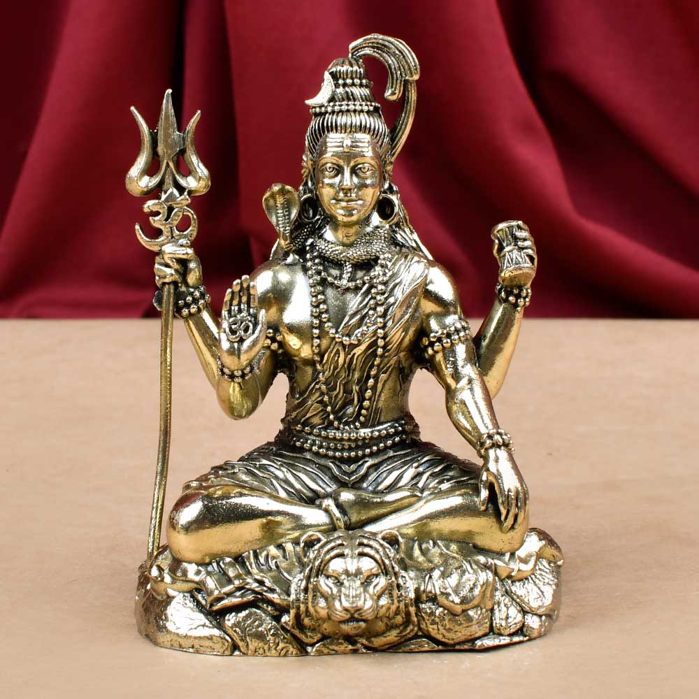 This intricately detailed idol shows Lord Shiva seated in a meditative yogic posture with his legs folded over a beautifully sculpted tiger skin base. His expression is calm and composed, radiating serenity and power. Lord Shiva holds a Trishul with an Om symbol in his right hand, a Damru in his upper left hand, and a Kamandalu in his upper right, while his lower left hand rests on his knee in a relaxed position and his lower right hand is raised in Abhaya Mudra, blessing devotees with protection and fearlessness.