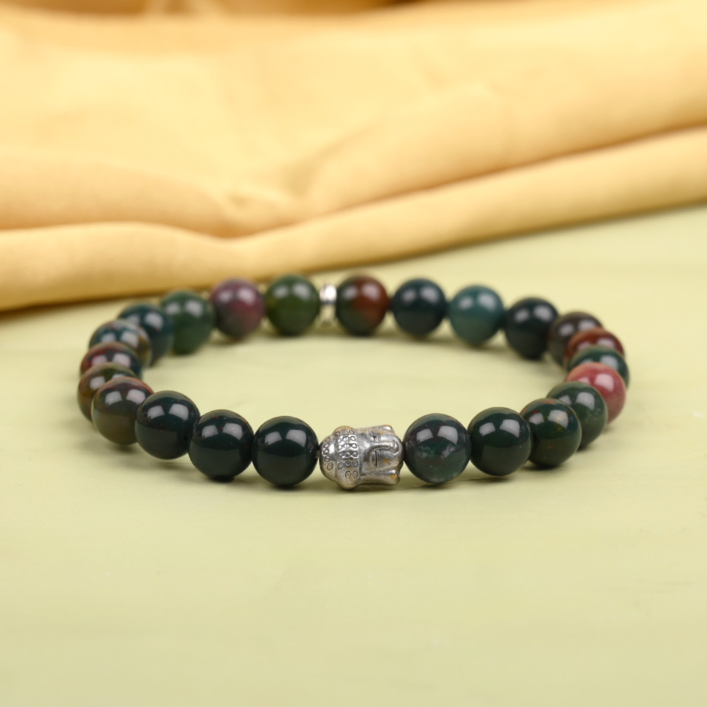 This elegant bracelet is crafted from natural Bloodstone beads, polished to reveal deep green tones with distinctive red inclusions, and accented with a finely detailed Buddha charm. The beads are securely strung, offering comfort, durability, and a balanced fit for daily wear. Bloodstone supports vitality and grounded awareness, strengthening focus and emotional steadiness. The Buddha charm reinforces calm mindfulness and inner discipline, encouraging composed awareness and spiritual clarity.