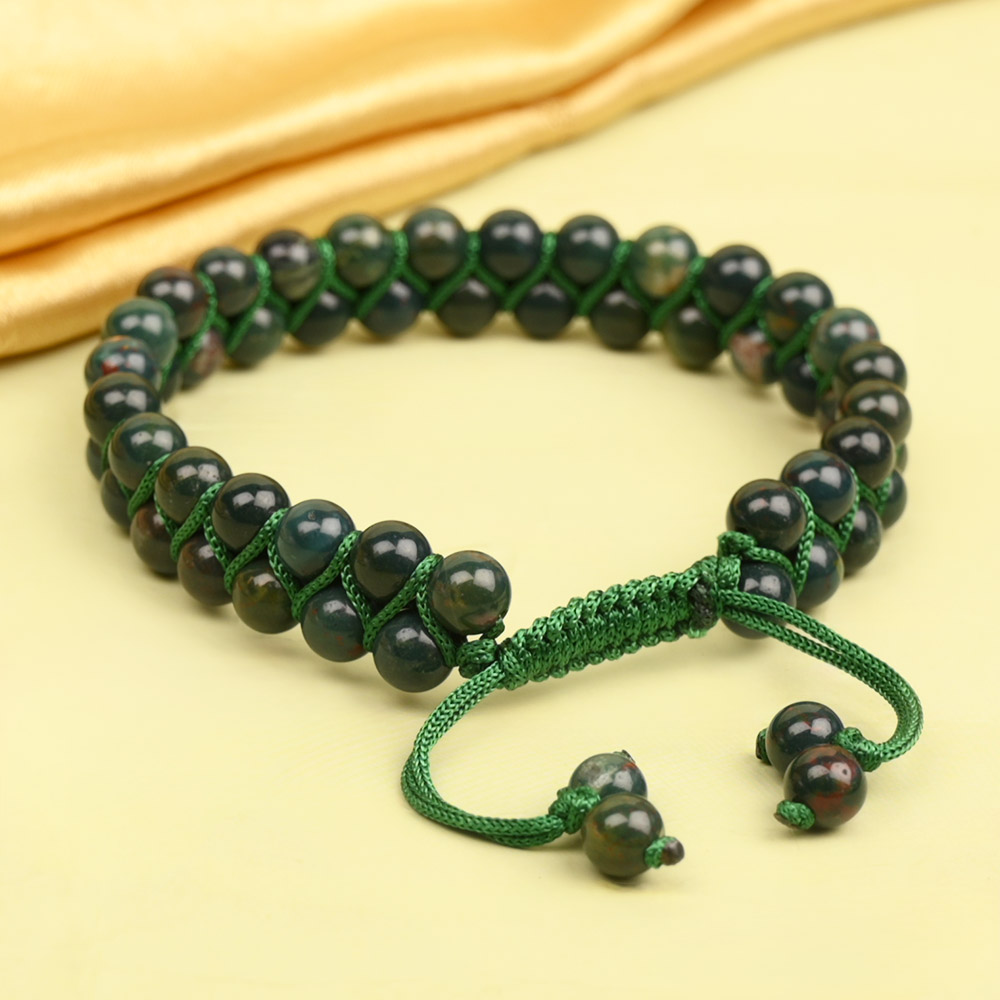 This refined bracelet is crafted from natural Bloodstone beads arranged in a double layer design, offering a fuller and balanced presence on the wrist. The beads display deep green tones with natural red inclusions, smoothly polished and secured with an adjustable closure for comfort and durability. Bloodstone supports vitality and grounded awareness, strengthening focus and emotional stability. The double layer form reinforces energetic balance, encouraging steady confidence and sustained inner strength.