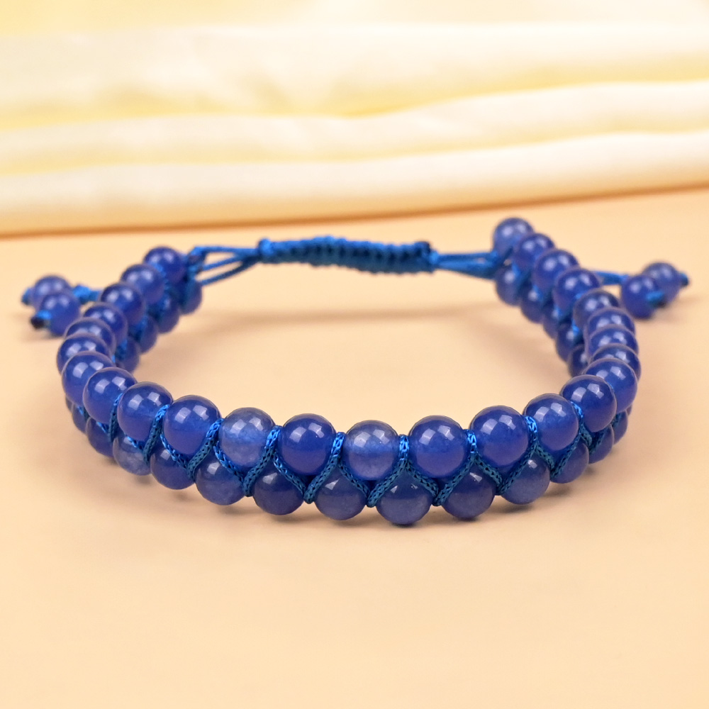 This bracelet features two neatly woven layers of natural Blue Jade beads, brought together with a durable macramé-style thread in a matching blue tone. The double-layer design gives it a fuller, more structured look while remaining comfortable and lightweight on the wrist.