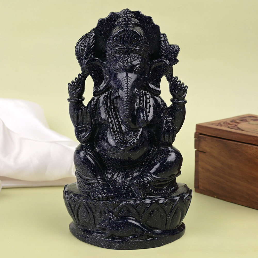 This idol of Lord Ganesh is entirely carved out of Sunstone dust, shimmering with silver specks all over its body. Sunstone carries the energy of Sun planet. It stands for independence and originality. Combination of Sunstone and Lord Ganesha serve as a divine fortune Idol.