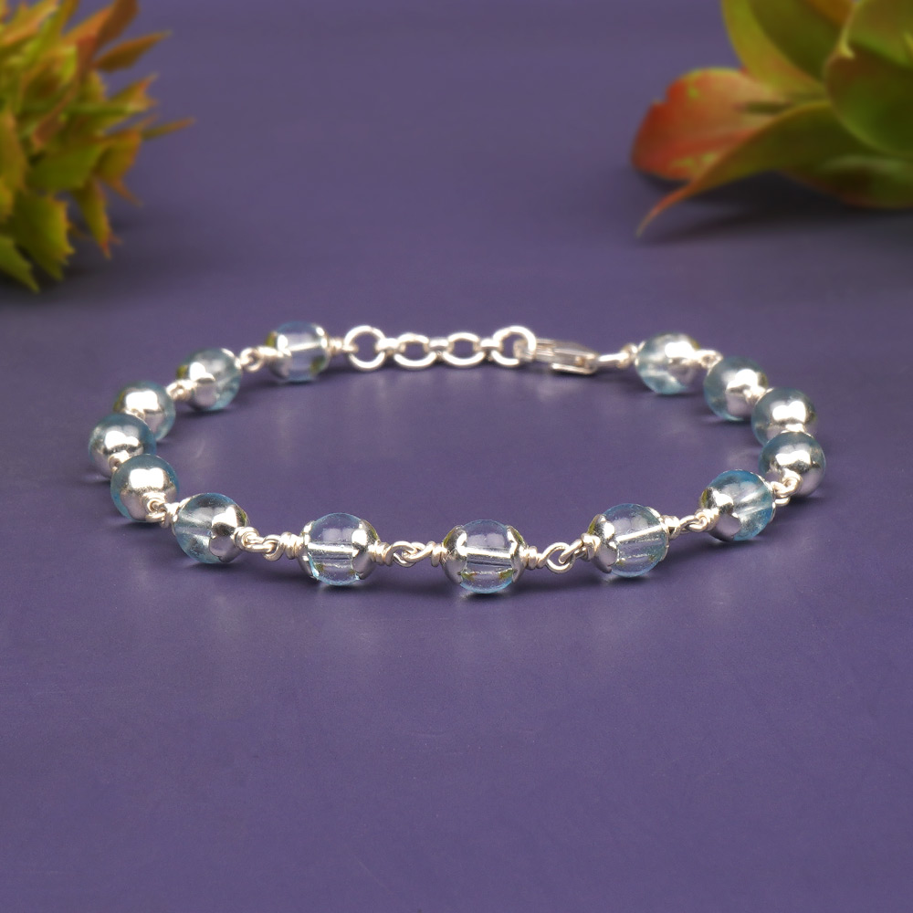 This elegant bracelet showcases round faceted Blue Topaz beads set between delicately crafted 925 silver flower caps. Each bead is linked using fine silver wire and secured with a pure silver clasp with adjustable rings. The calming blue tones and the subtle sparkle of the gem add a graceful charm to your wrist, making it perfect for everyday elegance or special occasions. Benefits: Enhances communication, soothes emotions, supports truth expression, brings mental clarity, and promotes emotional balance.