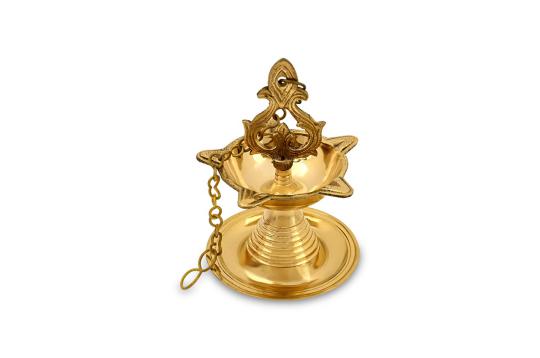 Beautiful designer Hanging Diya made in heavy shining brass will add spiritual fervor to your Puja room. This shiny brass diya or lamp has five notches to place five cotton wicks. You can hang it inside your altar or puja temple. The five orange flames will cast a lovely light on the gods and goddesses and create a devotional ambience. Lighting of Diya/lamp is an essential part of all the pujas in Hinduism.