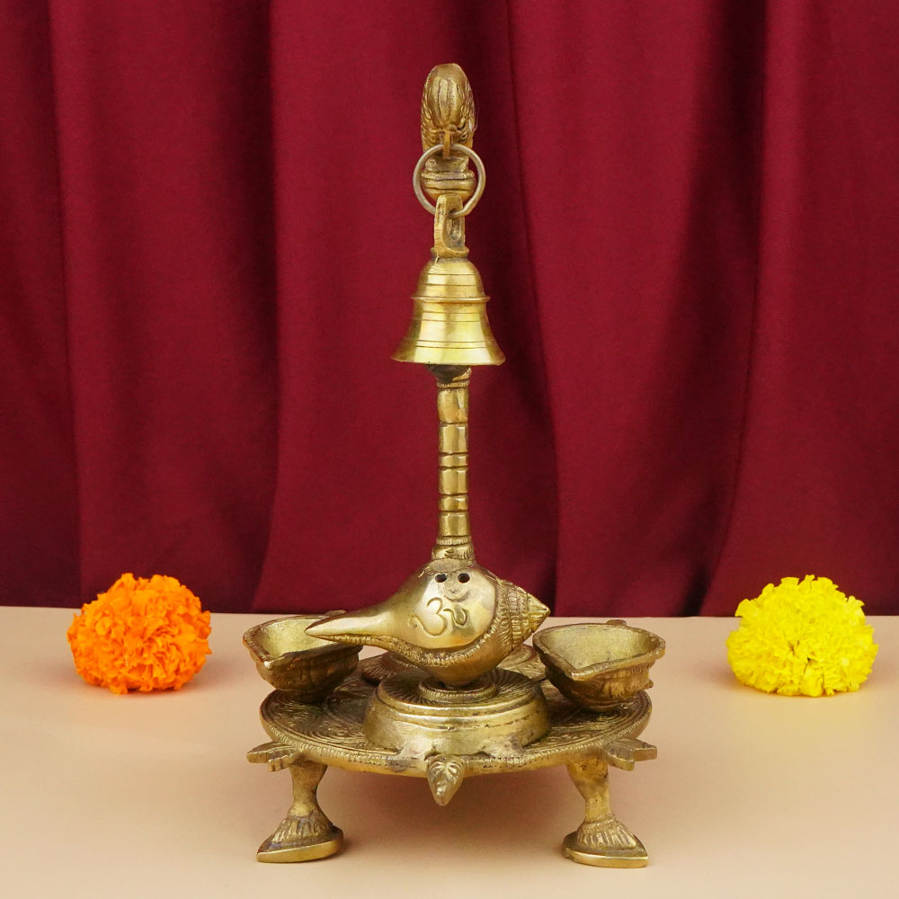 Intricately artwork on this tortoise shaped stand having 2 oil lamps makes this a beautiful piece for your living room or altar. A cuckoo bird is perched on the top holding a 5 cotton wick oil lamp. In this stand, a Brass Shankh is placed in the Centre position instead of the diya.
