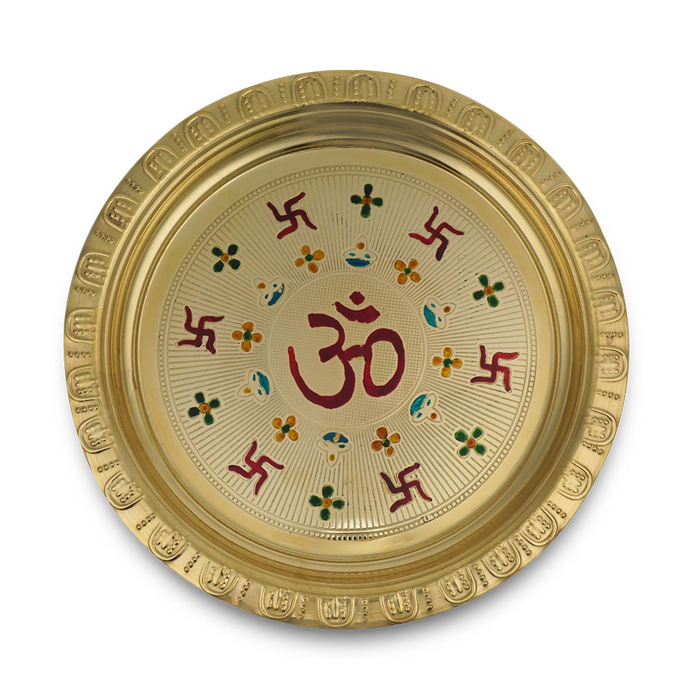 This magnificent puja plate features rich Meenakari work illustrating OM & Swastik along with floral design patterns, bound to grace your puja rituals. The plate is ideal for use during festivals, weddings, and puja ceremonies. Made of brass, the plate with its elegant traditional design is a great gifting idea for festivals and special occasions. It can also be used as an Aarti thali, holding oil lamps, Kumkum, rice, flowers, and other items. The depth and elevated edges offer ample space to store water during the Abhishek rituals of Small Sized Deity idols and/or Shivling. Due to its intricate rich design, the puja Thali is also a great gifting idea for religious occasions.