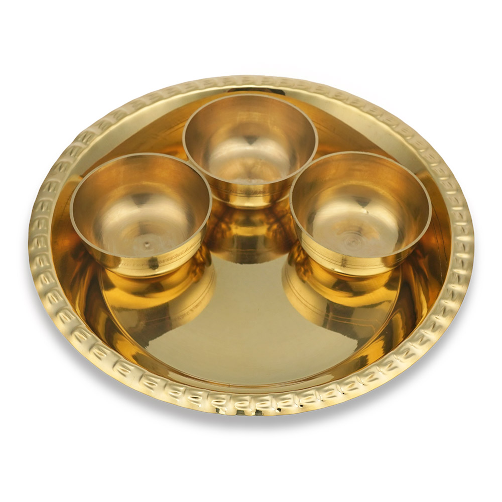 A deep brass tray in golden brass holds three big bowls in which you can keep anointing powders such as haldi (Turmeric), kumkum (Vermilion), chandan (Sandalwood), rice grains, flowers or sweet offerings for your favorite gods and goddesses.