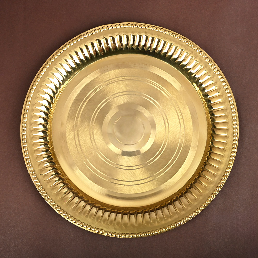 This Puja Thali is simple with minimalistic design on it and made of shiny Brass. Brass is widely used for puja items in India. This Brass puja thali has elevated sides with slight curve outside, making it convenient to hold the thali, especially while performing 'aarti'. The elevated sides have stripe like design etched on it and the outer edge of the side has medium size round design.
