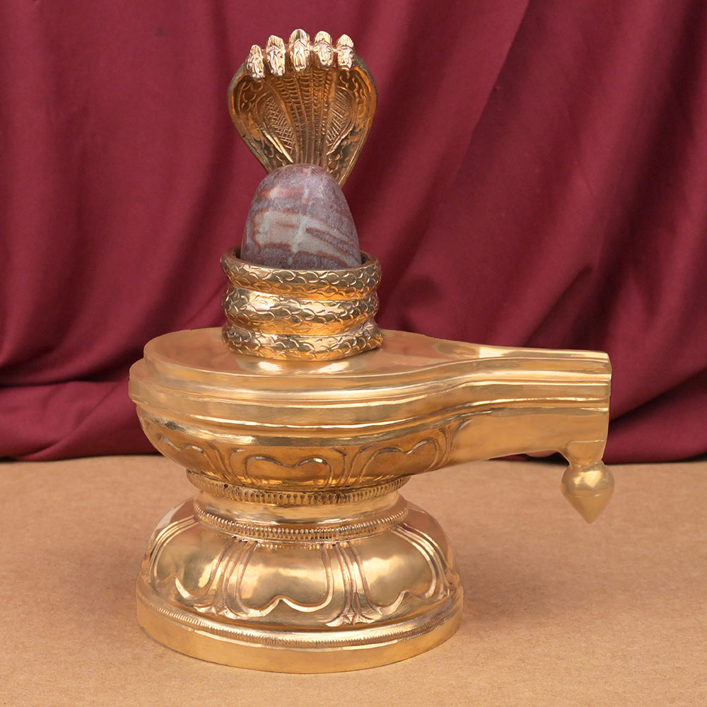 "The Shivalingam, a sacred symbol of Bhagwan Shiva, is exquisitely set upon a Bronze Jaldhari Yoni. This Jaldhari Yoni is a heavy and beautifully crafted piece, meticulously created by traditional temple artisans of South India. It features a 5-hooded and 3-coiled snake and yoni is embellished with flower petal designs, showcasing the artisans' exceptional craftsmanship and devotion.