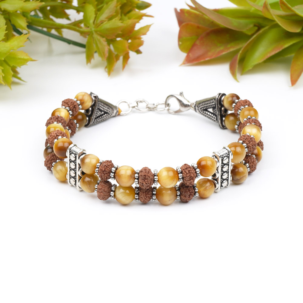 This power-packed bracelet combines lustrous brown Cat’s Eye beads and natural 8 Mukhi Rudraksha beads, strung in a two-layered design with antique-finish spacers and a strong clasp. The union of Cat’s Eye and 8 Mukhi Rudraksha creates a spiritually protective and grounding combination that supports transformation and inner strength. Combined Benefits: Removes malefic effects of Ketu and Rahu, guards against negative energies and psychic attacks, protects during spiritual practices, boosts courage and self-confidence, enhances focus and stability, dissolves fear and confusion, and supports smooth overcoming of obstacles and karmic hurdles.