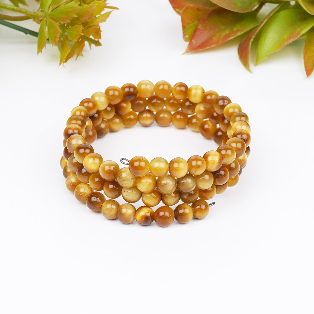 Crafted with rich, golden-brown Cat’s Eye round beads, this spiral bracelet wraps comfortably around the wrist in a coiled stack design. The beads exhibit a natural chatoyancy, creating a subtle shimmer that adds depth and character to the bracelet’s earthy tone. Benefits: Shields from negativity, improves concentration and confidence, strengthens inner vision, brings emotional grounding, and supports Ketu-related astrological healing.