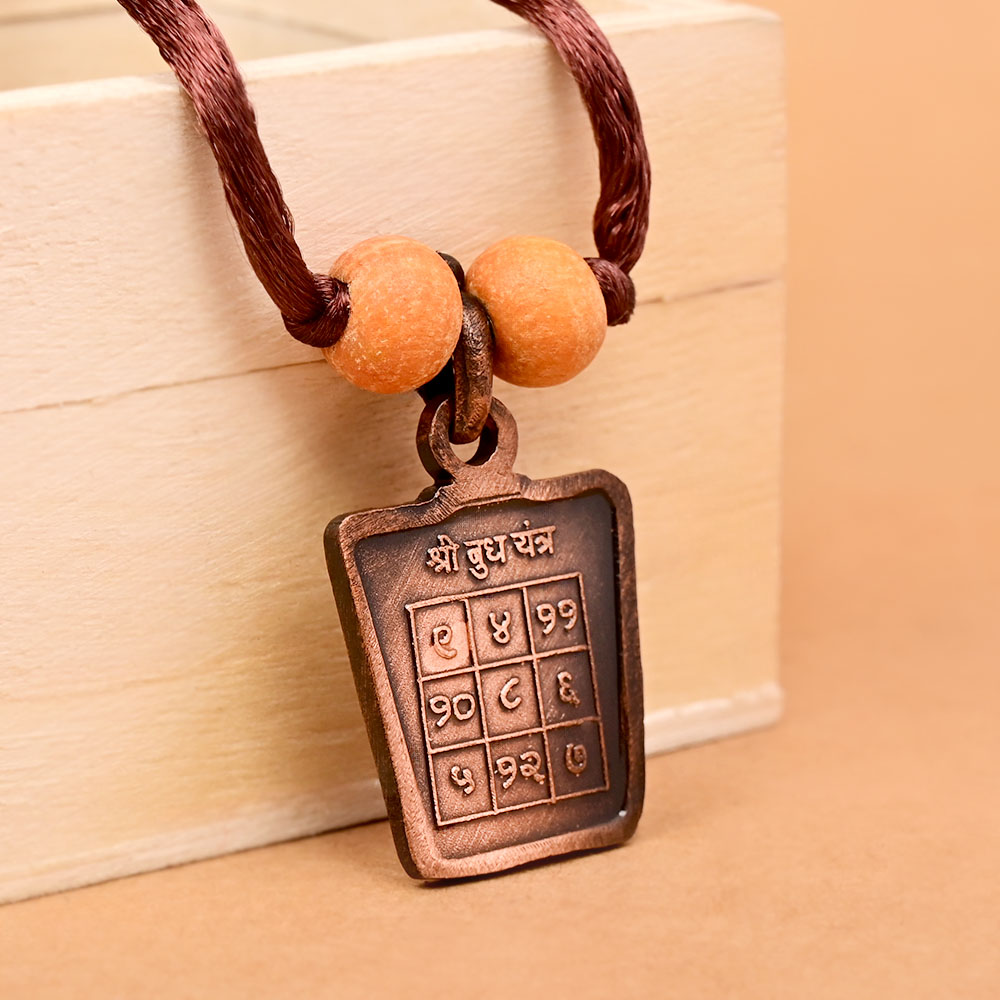 The Siddh Buddh Yantra Locket is made of pure copper and embossed with the Buddh Yantra on one side and the Deity image on the other. The Budh Yantra is a set of mystical numeric combinations that resonate with the positive powers of Planet Budh or Mercury. As per Vedic astrology, Budh represents intellect, logical mind, wit and humor, communication, speech, and fine arts. When planet Budh is in an unfavorable position in the Natal chart of a native, it causes unhappiness due to miscommunication, rough speech, the inability to use one's intelligence or Buddhi efficiently, unhappiness in relationships, a lack of creativity, and such other consequences.