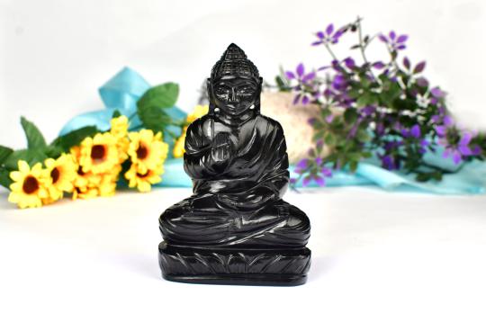 Idol of Buddha seated on lotus has been artistically crafted in 100% natural green Jade gemstone. Buddha is seen wrapped in clothes and raising his hand in Abhay mudra (blessing pose). Buddha in this mudra personifies peace, protection and compassion. Lord Buddha had used this mudra to pacify an attacking elephant, personifying fearlessness. This Idol with additional benefits of the gemstone would promote healing energies. You can place this idol at your place, desk or any purified area to feel his blessings.