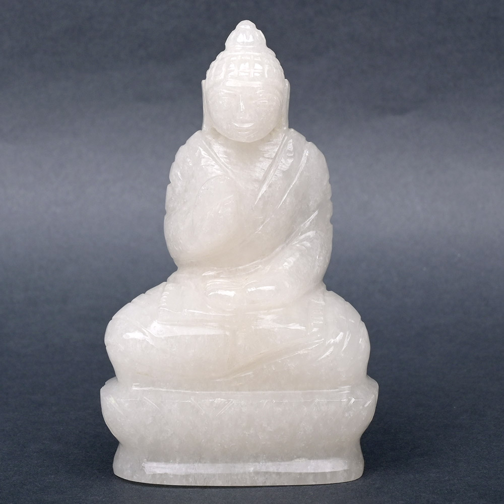 Idol of Buddha seated on lotus has been artistically crafted in 100% natural White Agate gemstone. Buddha is seen wrapped in clothes and raising his hand in Abhay mudra (blessing pose). Buddha in this mudra personifies peace, protection and compassion. Lord Buddha had used this mudra to pacify an attacking elephant, personifying fearlessness. This Idol with additional benefits of the gemstone would promote healing energies. You can place this idol at your place, desk or any purified area to feel his blessings.