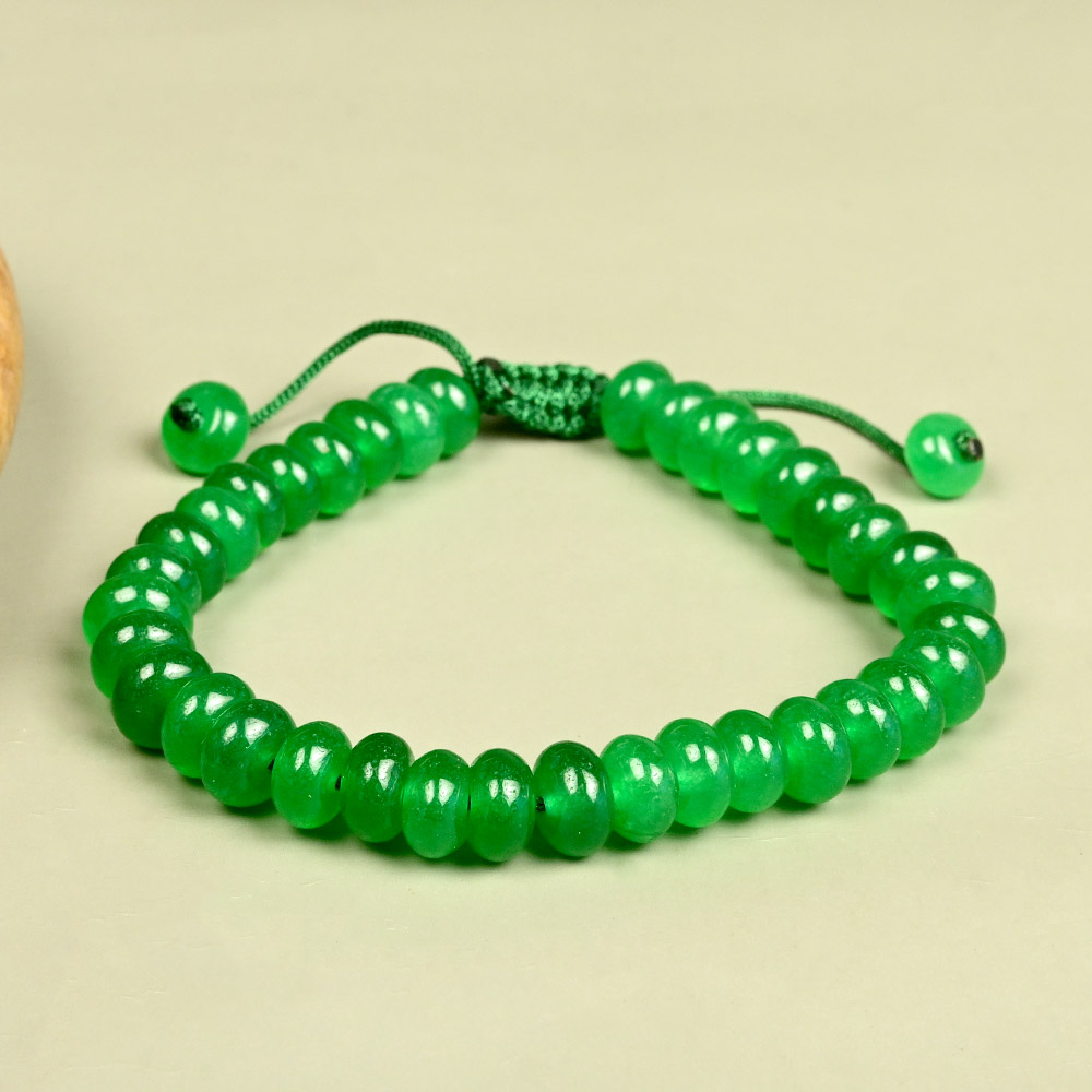 This handcrafted bracelet is composed of smooth, lustrous button-shaped Green Onyx beads, strung together with precision and symmetry. Each bead glows with a deep, translucent green that reflects light beautifully, creating a captivating visual rhythm across the wrist. The bracelet features a strong matching green thread with an adjustable sliding knot, allowing for a secure and comfortable fit. Its minimalistic yet vibrant design makes it suitable for both spiritual and everyday wear. Green Onyx is a stone of calm, concentration, and emotional strength. In Vedic tradition, it is associated with healing the heart and mind, helping one overcome confusion and reconnect with inner peace. Wearing this bracelet invokes a sense of emotional stability, attracts prosperity, and enhances one’s ability to speak with clarity and confidence. Spiritually, it harmonizes the Heart Chakra, dissolving emotional blockages and nurturing love, trust, and compassion in the wearer’s life.