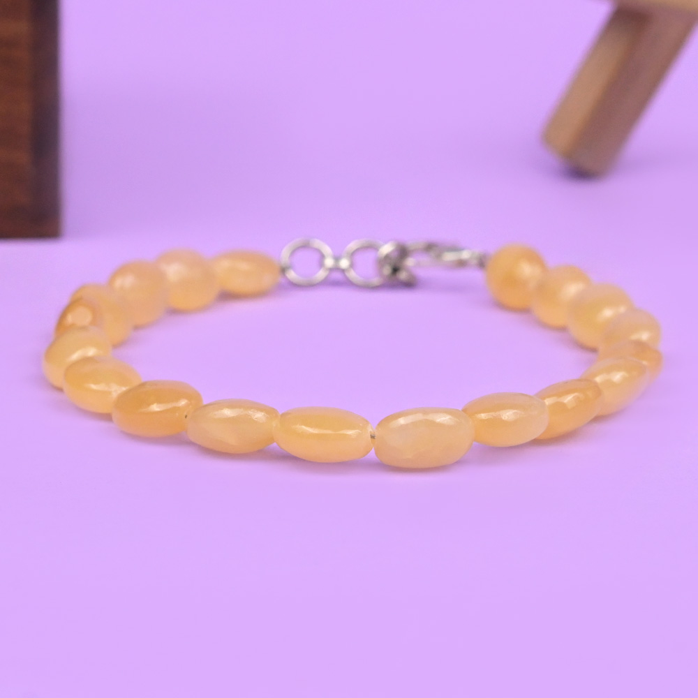 This Calcite Bracelet features smooth oval-shaped beads in soft yellow tones. The beads are evenly strung to create a simple and clean design suitable for daily wear. Each bead shows natural variations in shade and translucency, highlighting the natural character of calcite. The bracelet is finished with a secure clasp for comfortable use.