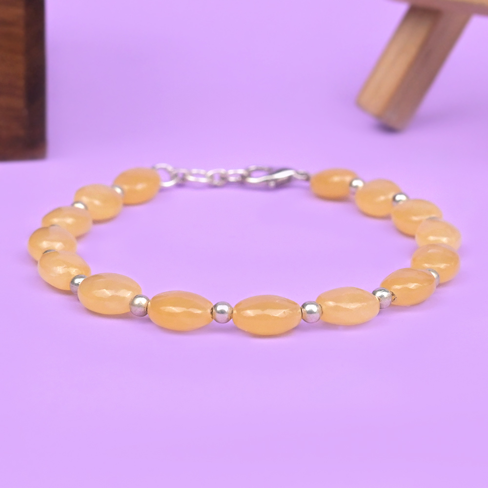 This Calcite Bracelet features smooth oval-shaped beads in soft yellow tones, paired with German silver ball spacers for a balanced look. Each bead shows natural variations in shade and translucency, highlighting the natural character of the stone. The bracelet is finished with a secure clasp for easy and comfortable wear.