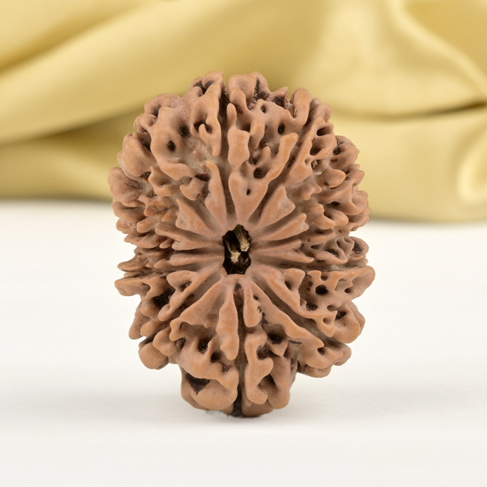 The 12 Mukhi Rudraksha embodies the energy of the Surya Deva and empowers the wearer with qualities of the Sun like authority, brilliance, and influence. It provides relief from stress and anger rooted in feelings of victimization, worries, suspicion, fear of the future, dependency, and low self-respect. The wearer gains personal power, drive, vigor, excellent health, and a commanding presence. This Rudraksha fosters leadership qualities, visionary abilities, and the motivation to take decisive action leading in achievements that bring name, fame, success, and recognition. Additionally, it supports overall health and aids in better digestion.