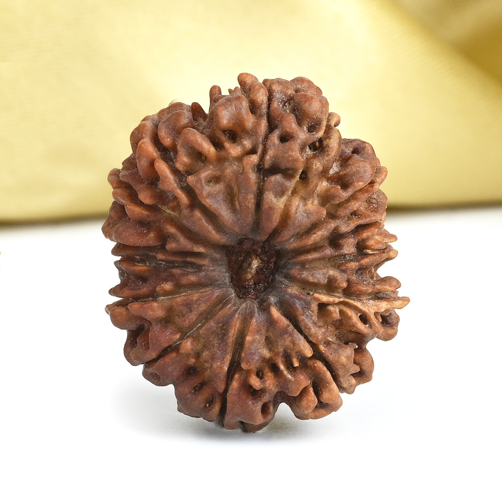 The 14 Mukhi Rudraksha is known as Deva Mani, the most precious divine gem. It embodies the mighty Hanuman and imparts the wearer with unwavering determination, divine insight, and the bravery to conquer any challenge. The wearer traverses the path of righteousness, achieving excellence, victory, and success. Hanuman, also known as Rudravtar, is a devoted disciple of Bhagwan Rama and imbues worshippers with His qualities of sincere devotion and unwavering loyalty towards dharma. Those attuned with this Rudraksha, and thus Lord Hanuman, are guided towards perfect mastery of the senses and virtues such as endurance, fearlessness, and courage. Wearing this Rudraksha helps alleviate uncontrolled anger and fear, bone pains, and blood-related disorders.