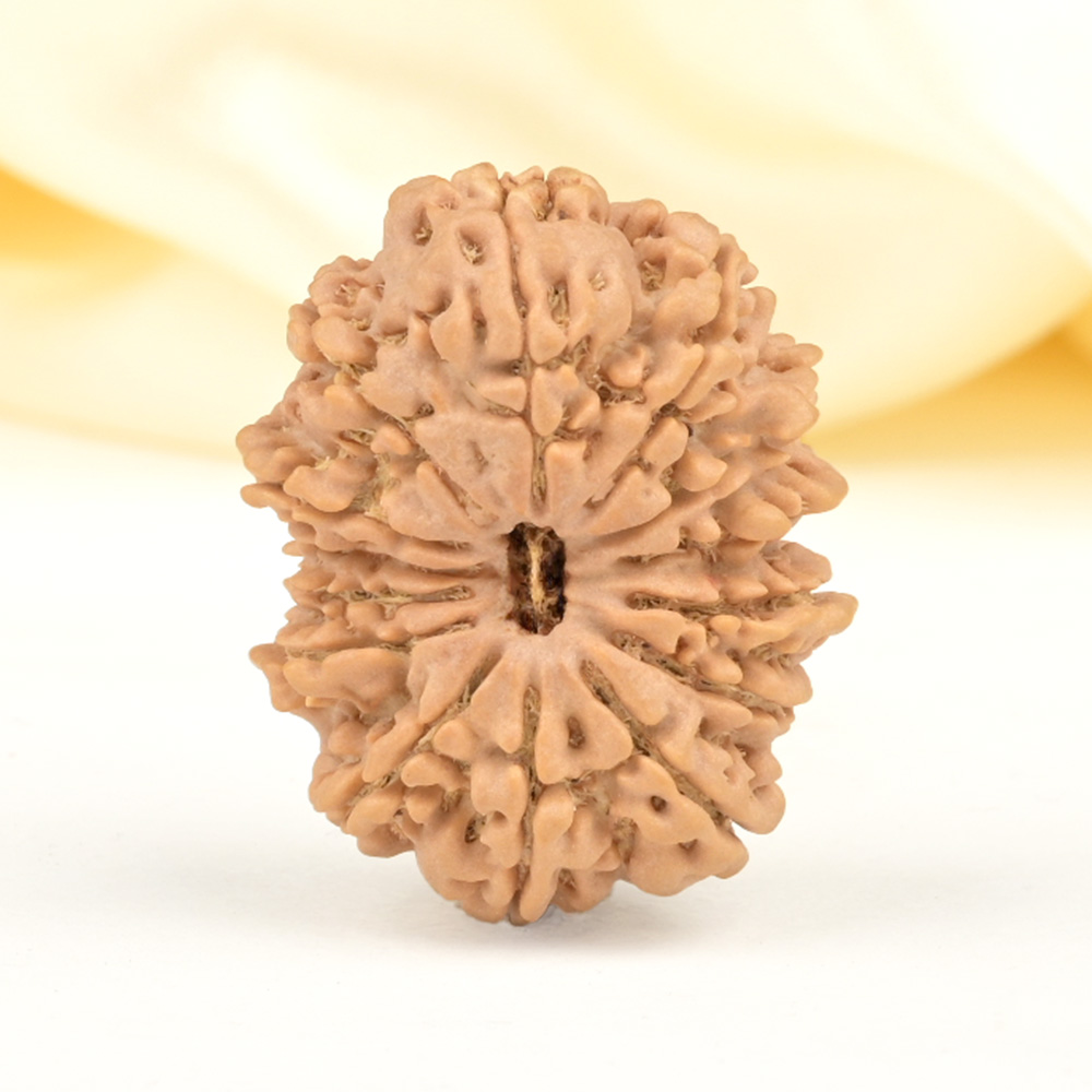 The 14 Mukhi Rudraksha is known as Deva Mani, the most precious divine gem. It embodies the mighty Hanuman and imparts the wearer with unwavering determination, divine insight, and the bravery to conquer any challenge. The wearer traverses the path of righteousness, achieving excellence, victory, and success. Hanuman, also known as Rudravtar, is a devoted disciple of Bhagwan Rama and imbues worshippers with His qualities of sincere devotion and unwavering loyalty towards dharma. Those attuned with this Rudraksha, and thus Lord Hanuman, are guided towards perfect mastery of the senses and virtues such as endurance, fearlessness, and courage. Wearing this Rudraksha helps alleviate uncontrolled anger and fear, bone pains, and blood-related disorders.