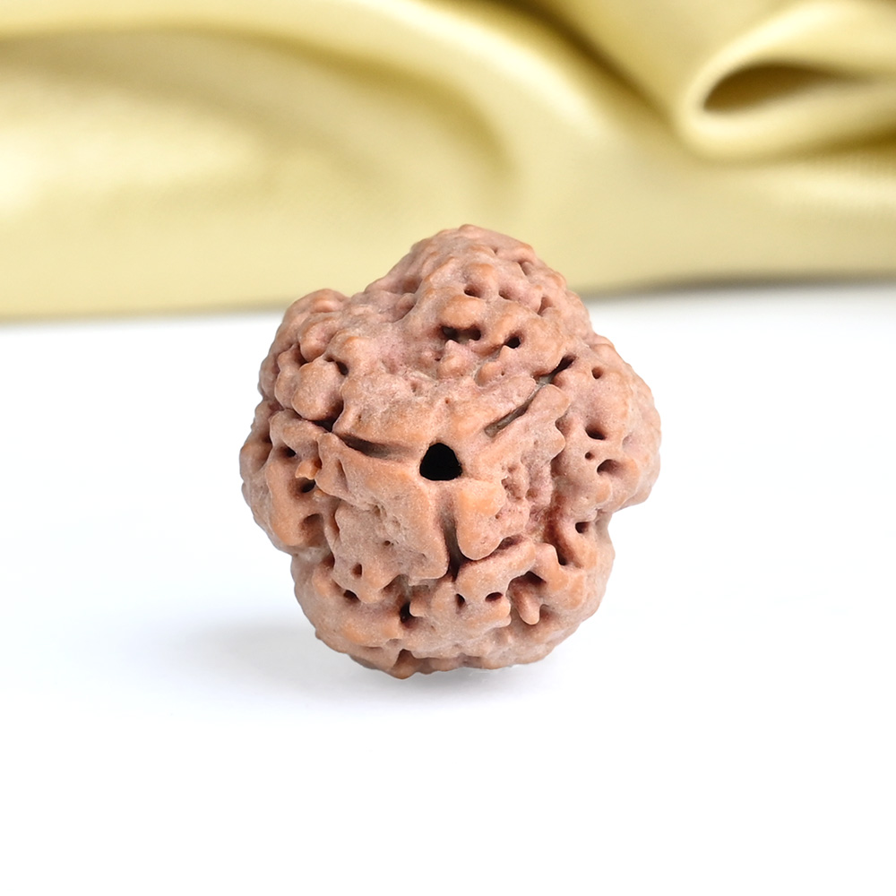 The 3 Mukhi Rudraksha represents Agni, the deity of fire. This Rudraksha has the ability to burn past karma, purify consciousness, and liberate individuals from the bondage of their past. This sets the stage for achieving success through virtuous actions in one's current existence. The 3 Mukhi Rudraksha has the power to purify one's past impressions of anger, hurt, shame, and stress, connecting them to their true and pure self, just like fire burns everything yet remains pure.