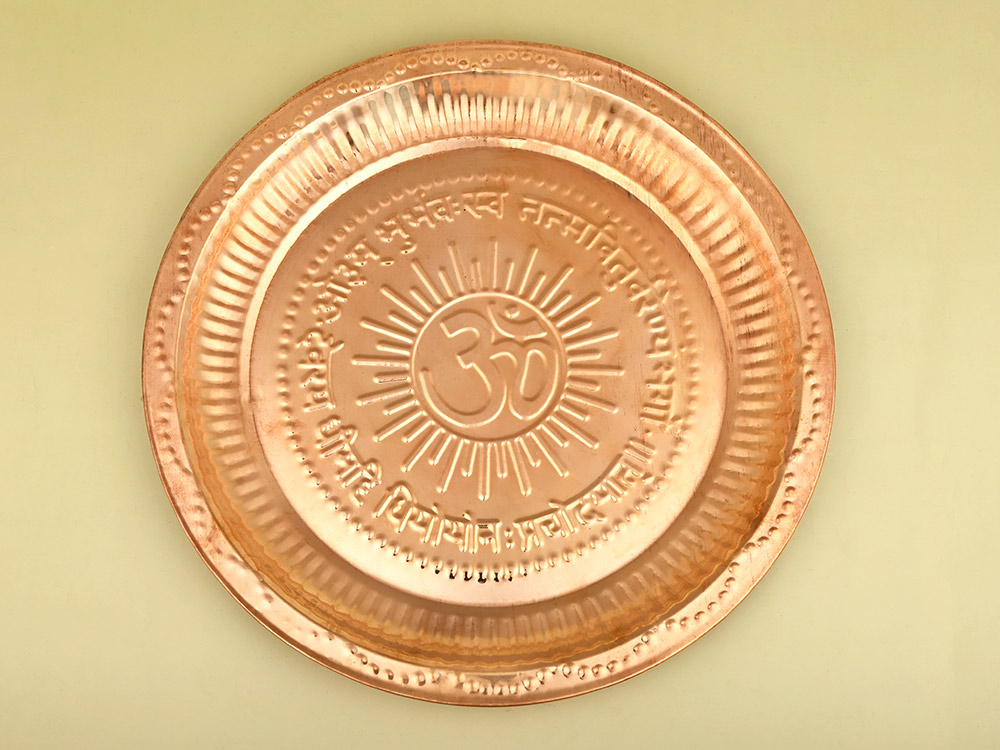 The beautifully designed plate made of shining copper is very charming addition to your puja room. The embossing of ‘Om’ mantra and Gayatri mantra gives it a divine appeal. It is used to hold all the essential puja ingredients or use as Aarti plate. Due to its elevated edges, it helps hold water when used for Abhishek rituals.