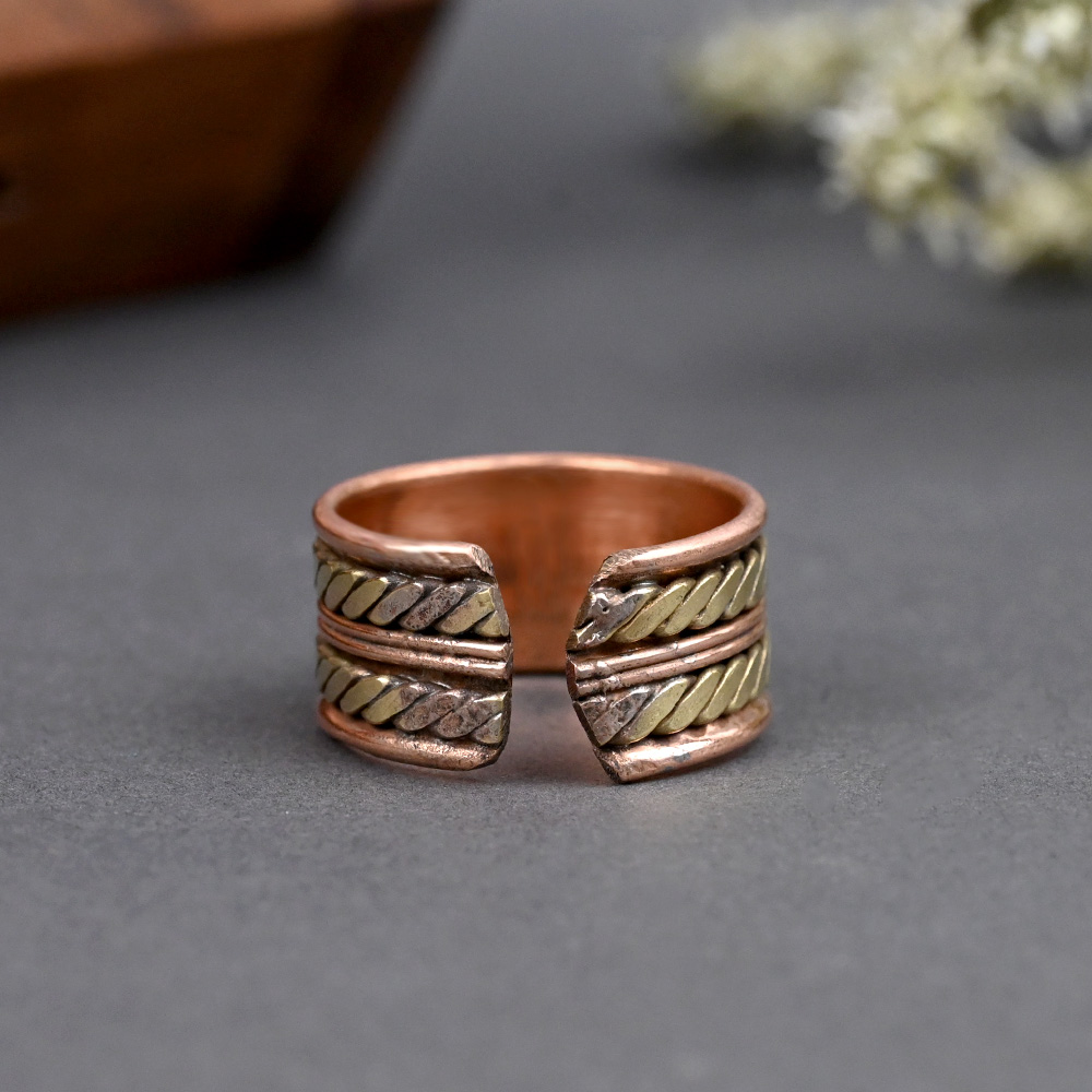This pure copper ring in robust design is beautiful way to show off your funky style. It features intricately twisted bands of silver and copper. The ring is made in adjustable feature is offers secured fit and smooth edges ensures comfortable wear. Pair this ring with any ensemble for a polished look. Wearing copper rings acts an effective mineral supplement as the mineral content of copper gets absorbed by body with ease. It particularly effective in providing relief from joint pain and common disease. It is believed to help avert the negative effects of planet Sun and Mars.