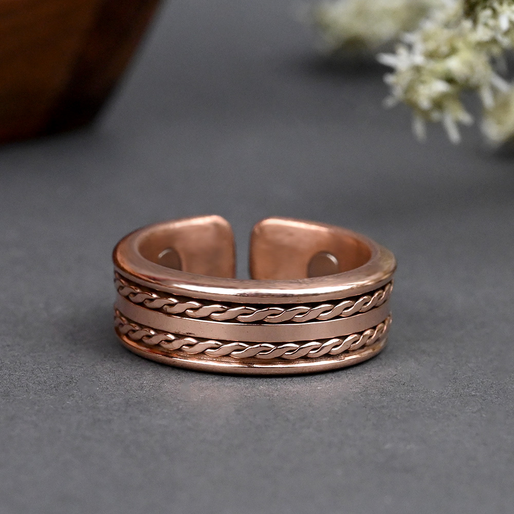 This broad pure copper ring would make a stylish accessory which would fit your lifestyle. The ring with neatly arranged bands in twisted rope pattern is perfect adornment that would suit for both men and women. With adjustable feature ensuring secure fit, the ring is suitable to wear every day. The copper ring is worn for good health as its content gets easily absorbed by the body. It helps improve immunity and prevent common diseases. It also helps bring control over senses and strengthen the effects of planet Mars.