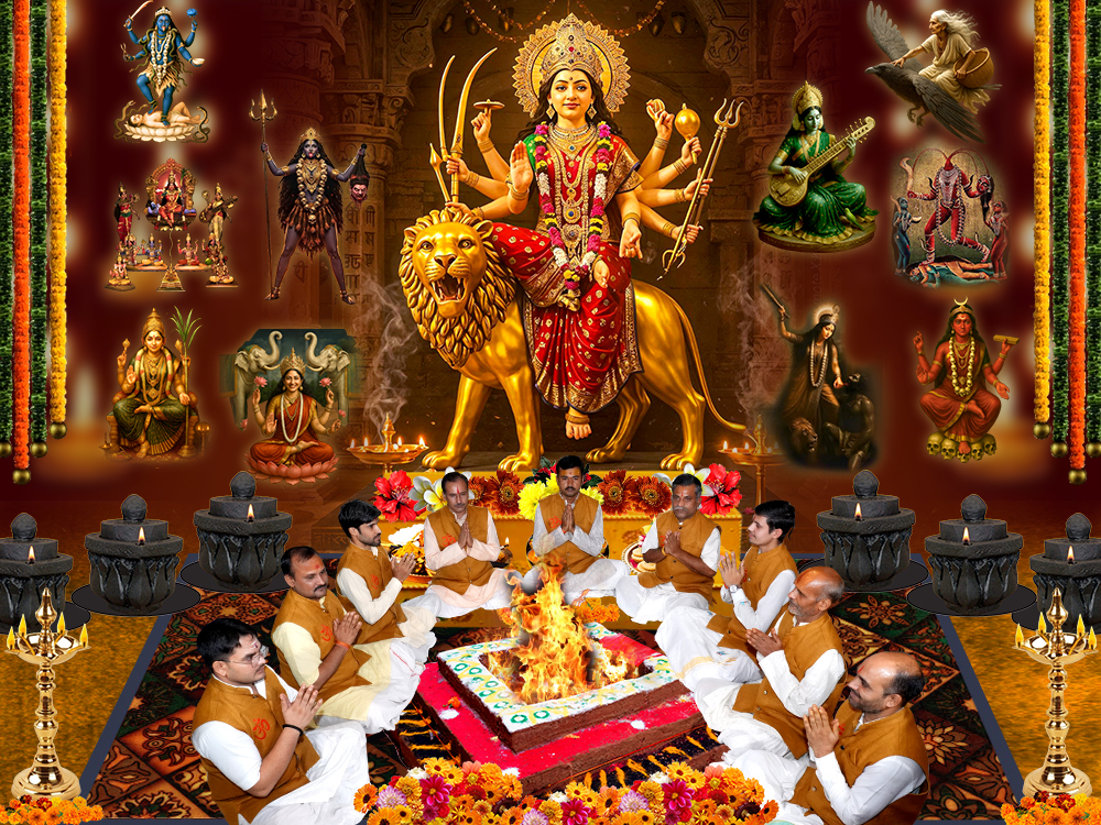Kalash Sthapana, Panchang Sthapana(Gauri Ganesh, Punyavachan, Shodash Matrika, Navgraha, Sarvotabhadra), 64 yogini Pujan, Shetrapal Pujan, Swasti Vachan, Sankalpa, Ganesh Pujan and Abhishek, Navgraha Pujan and 108 chants of each planetary mantra, Invocation of major Gods and Goddesses in Kalash, Das Mahavidya abhishek and Pujan, Mantra Japa of each Goddess, Kavach recitation of each Goddess, Dus Mahavidya mantra japa 1100 times for each Mahavidya, Homa, Arti and Pushanjali.