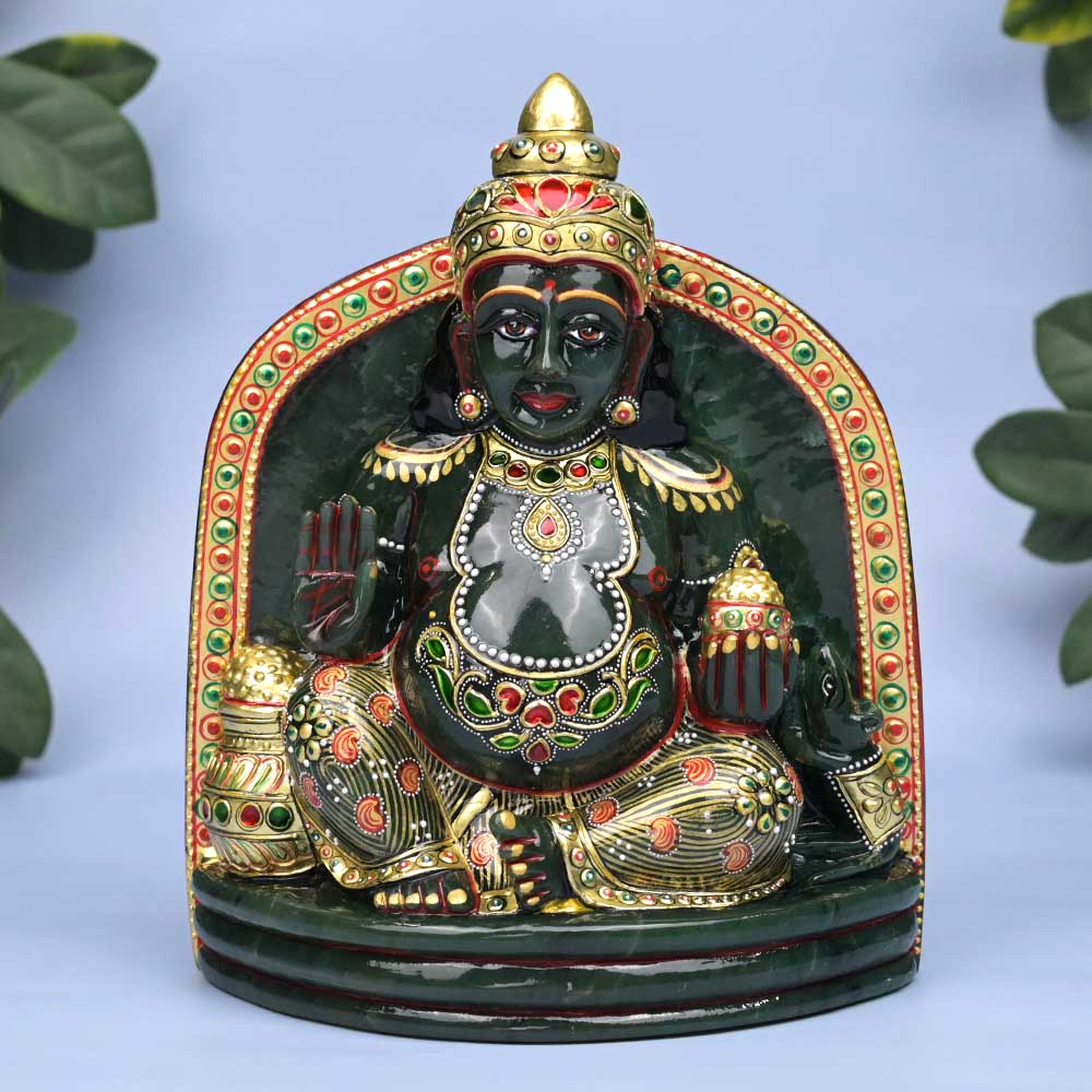 This brilliantly crafted idol of Kuber idol carved out of single piece of natural green Jade gemstone can make a divine family heirloom. It features Kuber in seated posture with green complexion of Jade, His colour described in scriptures. He has a big belly and is extravagantly decked in jewels while He holds a pot of gold in His hands and a mongoose and pot full of treasures are seen by His side. The embossed paintwork in colour and gold beautifully reflects the opulence which He signifies. Kuber is the custodian of Universal wealth and His worship bring inflow of wealth and attracts riches and new opportunities to generate income. Green Jade complements with the blessings of Kuber and guards the wealth from any kind of misfortune and attracts materialistic abundance. Install the idol in your living area, puja room, place of business or office for dual benefits of green Jade and blessings of Kuber.