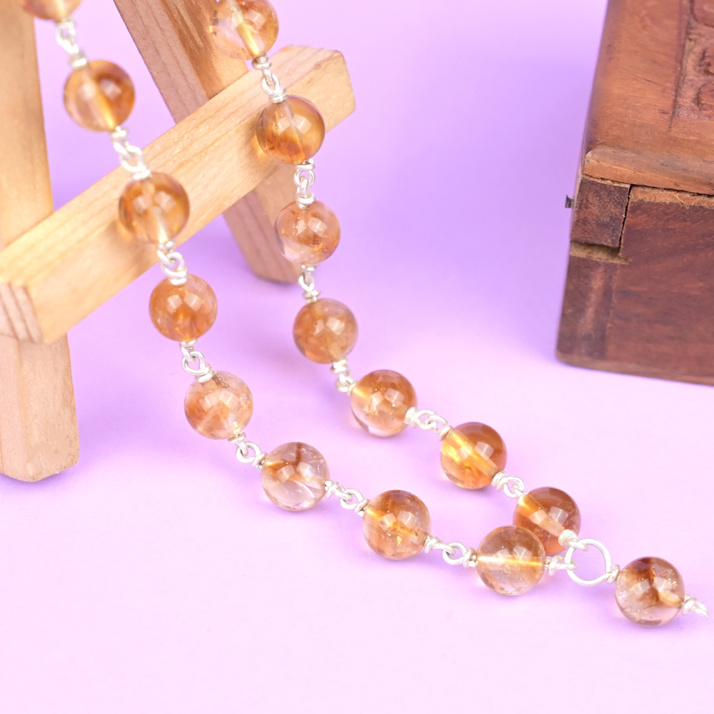 This mala features deep yellow citrine beads with a rich, honey-like transparency that adds warmth and brightness to its appearance. The beads are carefully hand-linked using 925 silver wire, giving the mala a clean, flowing structure that drapes beautifully when worn. The silver detailing complements the deep golden tones of the citrine, making it suitable for both daily spiritual practice and elegant wear.