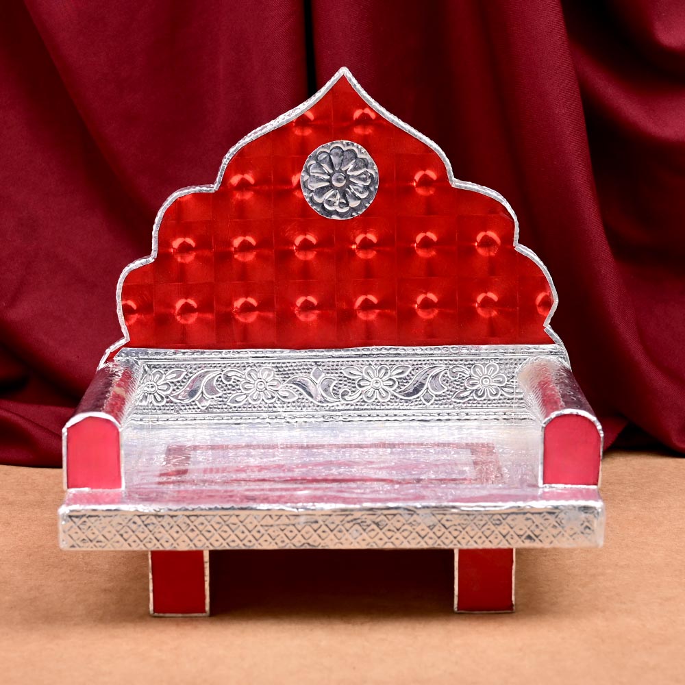 Grandiose deity throne handcrafted on wood with silver and red aluminum foil work would add elegance to your puja room. Used for seating Idols of Gods and Goddess or Yantras.