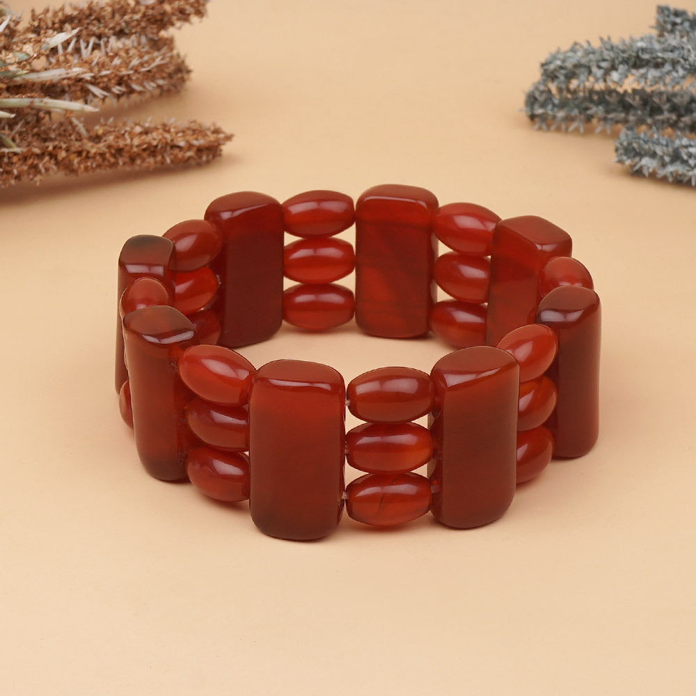 This striking bracelet showcases a unique designer layout of oval and rectangular Red Carnelian beads, arranged in a triple-layered elastic format that gives it both a bold look and a flexible fit.