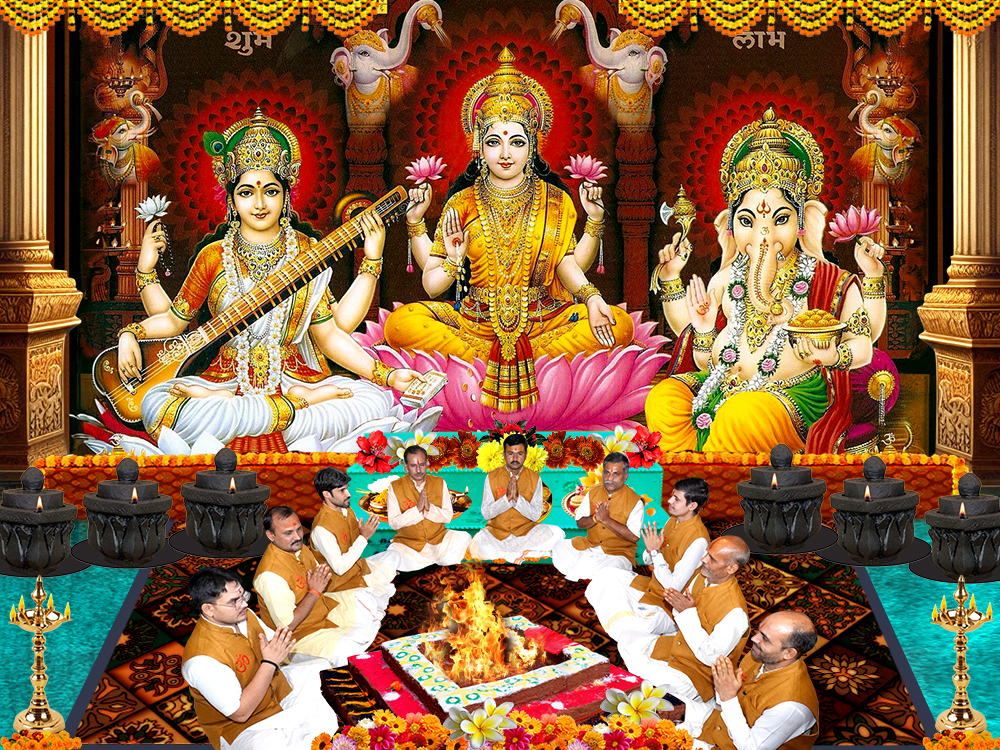 This grand Vedic puja will include Kalash Sthapana, Panchang Sthapana (Gauri Ganesh, Punyavachan, Shodash Matrika, Navgraha, Sarvotabhadra), 64 Yogini Pujan, Shetrapal Pujan, Swasti Vachan, Sankalpa, Navgraha Pujan (with 108 chants of each planetary mantra), invocation of major deities in Kalash, Ganesh–Lakshmi–Saraswati Abhishek and Pujan, Vishnu Pujan with Vishnu Stuti, Kuber Pujan with mantra japa, recitation of Ganesh Atharvashirsha, Sri Suktam, Saraswati Stotra, Lakshmi Stotra, Kanakdhara Stotra, prayers to books, coins, gold and other wealth, offerings to Goddess Lakshmi, Lakshmi Mantra Japa (11,000 times), Homa, Aarti, and Pushpaanjali.
