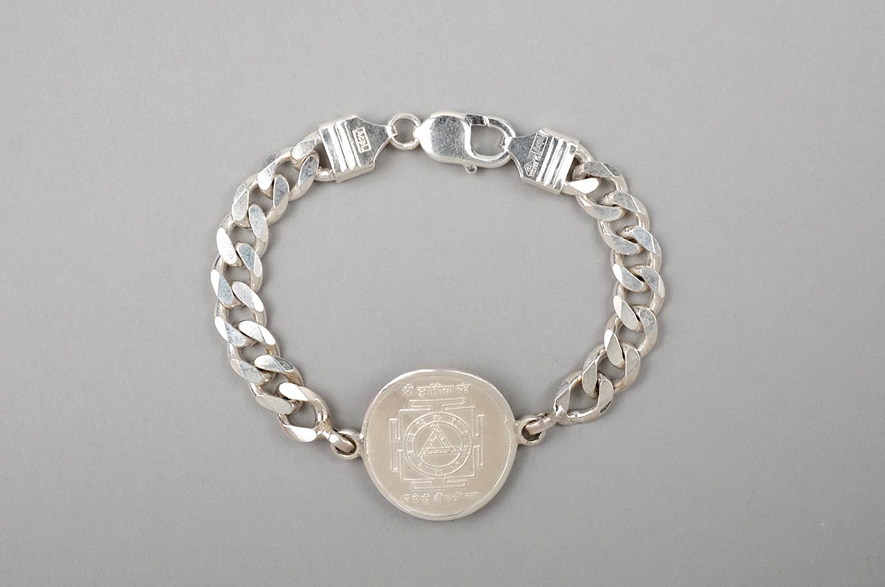 The silver Durga Bisa Yantra bracelet with silver chain has a sacred Durga Bisa Yantra embossed on one side and Goddess Durga on the other. The Yantra is considered lucky for entrepreneurs. It removes difficulties, overcomes negativity, protects from danger and overpowers the enemies. It attracts luck in business, wealth and prosperity.