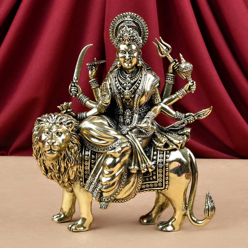 This intricately crafted idol depicts Goddess Durga seated majestically on a roaring lion, holding various weapons in her multiple arms including the trident, sword, and chakra. Crafted from Ashtadhatu, a sacred alloy of eight metals—gold, silver, copper, lead, zinc, tin, iron, and mercury—this idol embodies the traditional art and energy of Hindu worship. (Note: Gold and silver are present in trace amounts.) The idol has a rich antique finish with fine detailing in the facial features, ornaments, and attire, reflecting divine strength and protective energy.